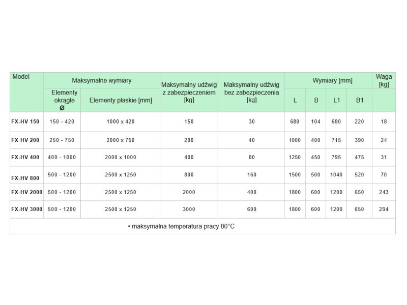 Maksymalny udźwig systemu FX-HV 800 bez użycia trzpieni podporowych wynosi 160 kg.