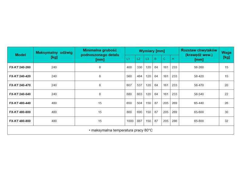 | Grubość podnoszonego elementu, przy której udźwig FX-KT 240-470 wynosi 100% |