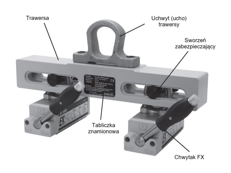 Magnetyczny uchwyt trawersowy FX-KT 240-470 dzięki zastosowaniu dwóch chwytaków magnetycznych FX-150 pozwala na podnoszenie i transportowanie niemal każdego elementu. Szczególnie jest to przydatne do elementów z centralnym wycięciem, gdzie zastosowanie jednego chwytaka może być niebezpieczne ze względu na przesunięty środek ciężkości. Uchwyt FX-KT idealnie sprawdzi się również przy detalach o większej długości. Dzięki zastosowaniu dwóch chwytaków serii FX i regulowanym rozstawem niweluje się ugięcie przenoszonych elementów. Dodatkowo użycie dwóch chwytaków o mniejszym udźwigu sumarycznym niż jeden, pozwala na lepsze wykorzystanie przy elementach cienkich, gdzie grubość detalu wpływa na udźwig rzeczywisty. Łatwy montaż i demontaż chwytaków sprawia że chwytaki mogą być także wykorzystane pojedynczo, np. do przenoszenia mniejszych elementów. Stalowa konstrukcja trawersy jest całkowicie powlekana proszkowo.