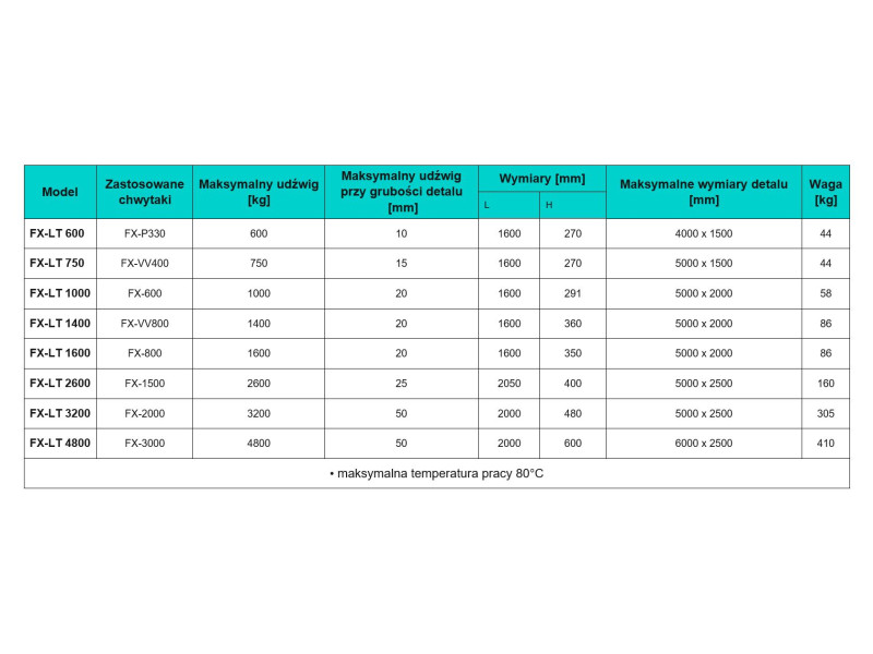 | Grubość podnoszonego elementu, przy której udźwig FX-LT 600 wynosi 100% |