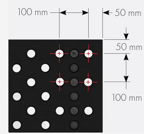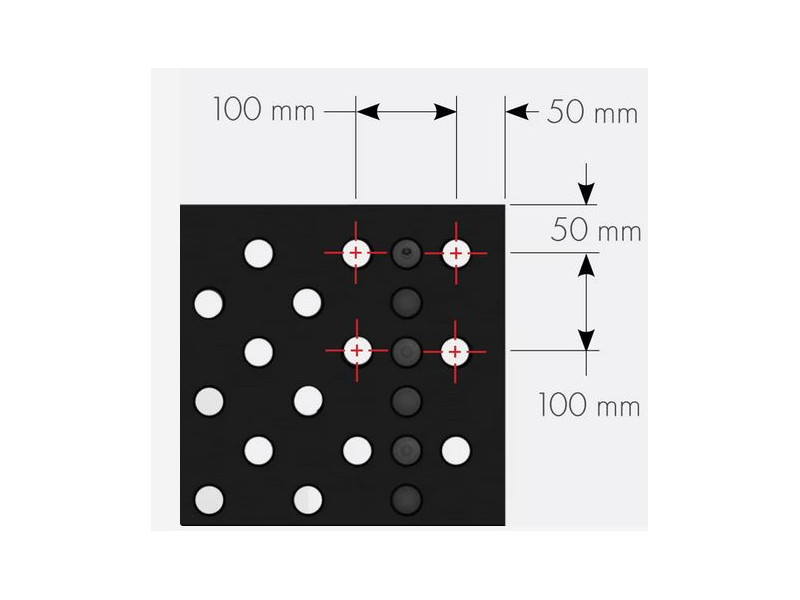 Rozstaw otworów 100 mm z dodatkową siatką 100 mm przesuniętą o 50 mm w osi x i y, tzw. siatka ukośna.