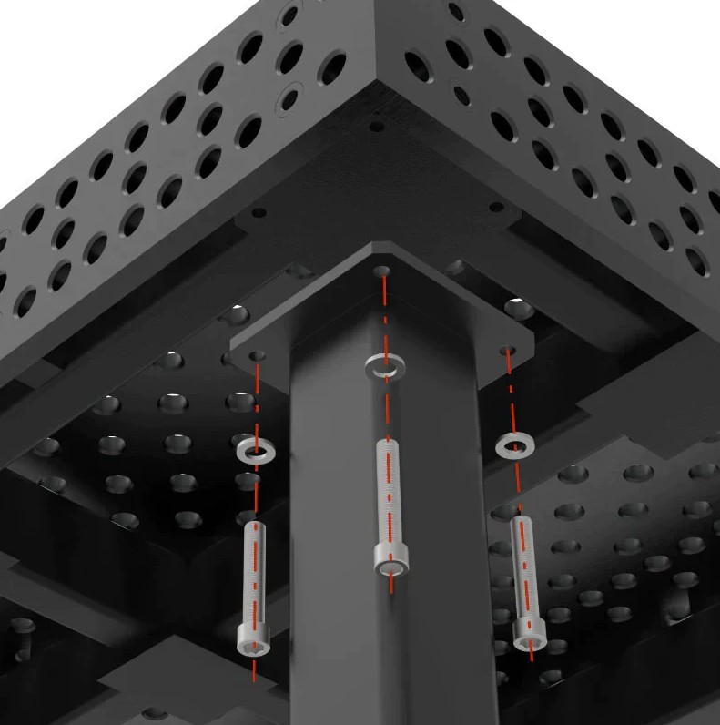 Do każdej nogi dołączone są cztery śruby M12 i podkładki do montażu na kołnierzach w dolnej części ramy stołu.