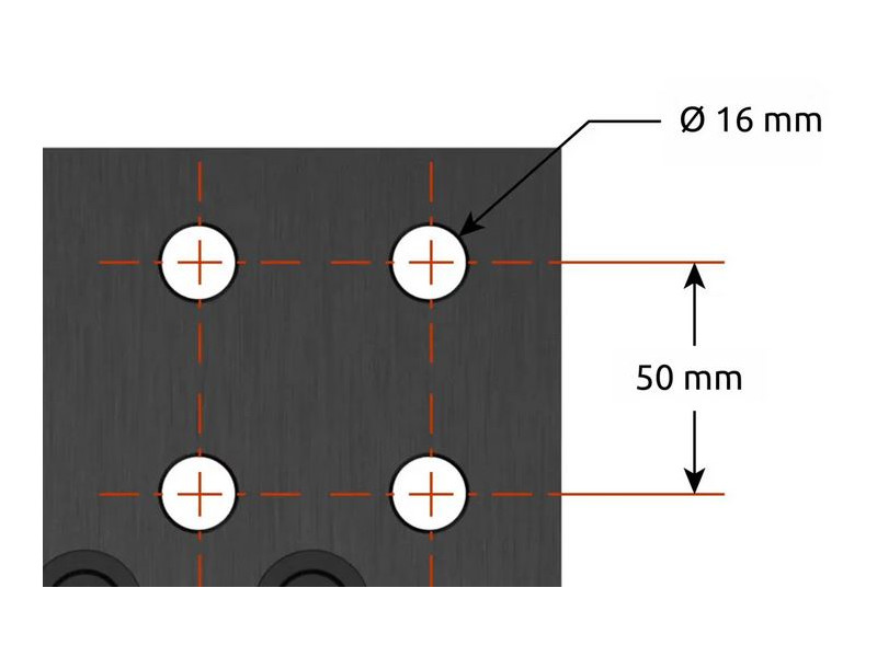 Płaskość stołu: ±0,125 mm na 600 x 600 mm Rozstaw otworów: 50 mm