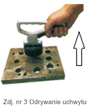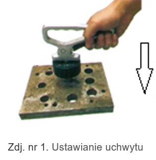 Dla bezpieczeństwa ustawiać uchwyt na przenoszonym elemencie tylko, gdy dźwignia jest podniesiona jak na zdj. nr 1. Po ustawieniu uchwytu w geometrycznym środku podnoszonego elementu zwolnić dźwignię i następnie podnieść uchwyt za rękojeść (zdj. nr 2). Przed podniesieniem elementu upewnić się, że element jest mocno i pewnie trzymany przez uchwyt. Po przeniesieniu i ustawieniu elementu na stabilnym podłożu, ponownie podnieść dźwignię co pozwoli na łatwe odczepienie uchwytu (zdj. nr 3).